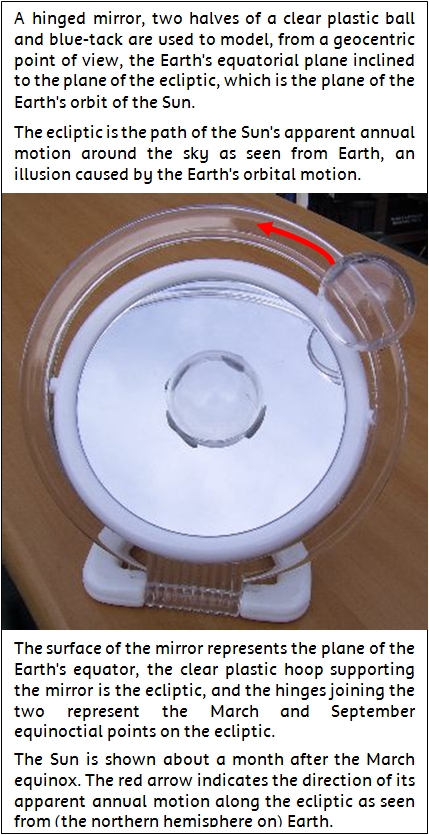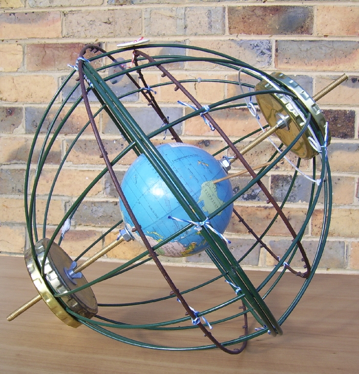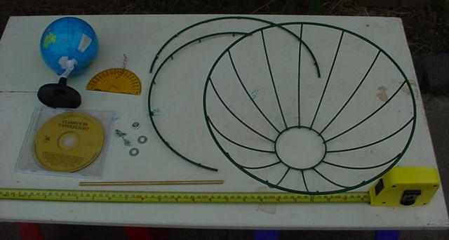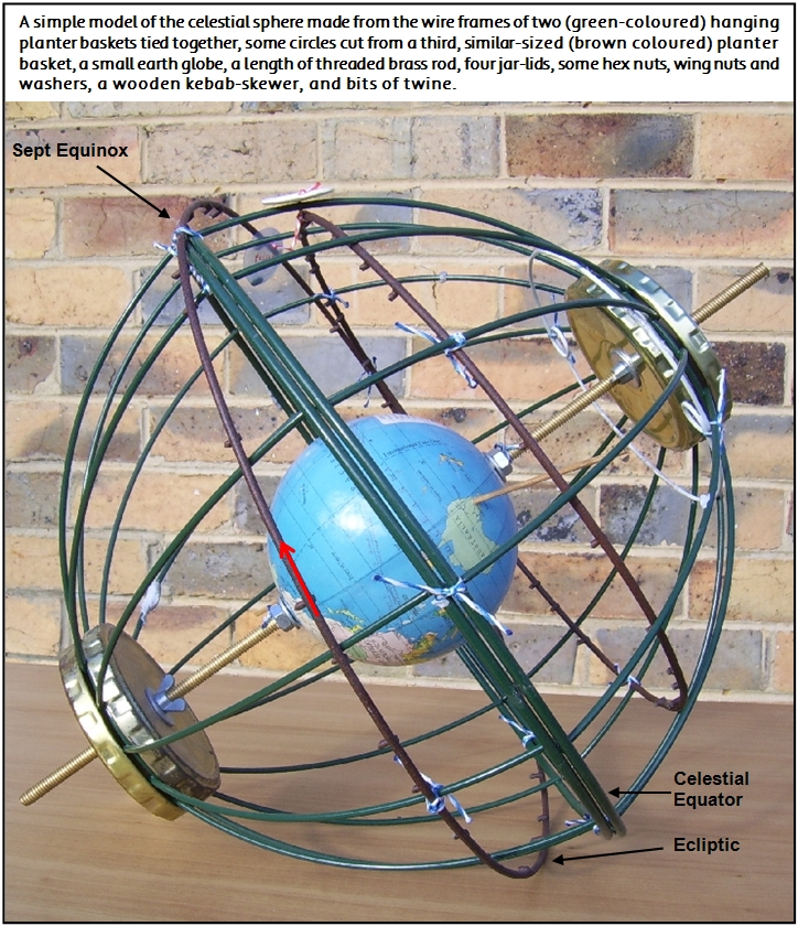 The "Observer's Horizon" is a pot-plant holder (wire frame, horizontal ring on tripod design). The ring is about the same diameter as the sphere. When the sphere is lowered into the holder it fits snugly about half way down. When the sphere is correctly oriented in the holder, it represents the observer's celestial horizon.