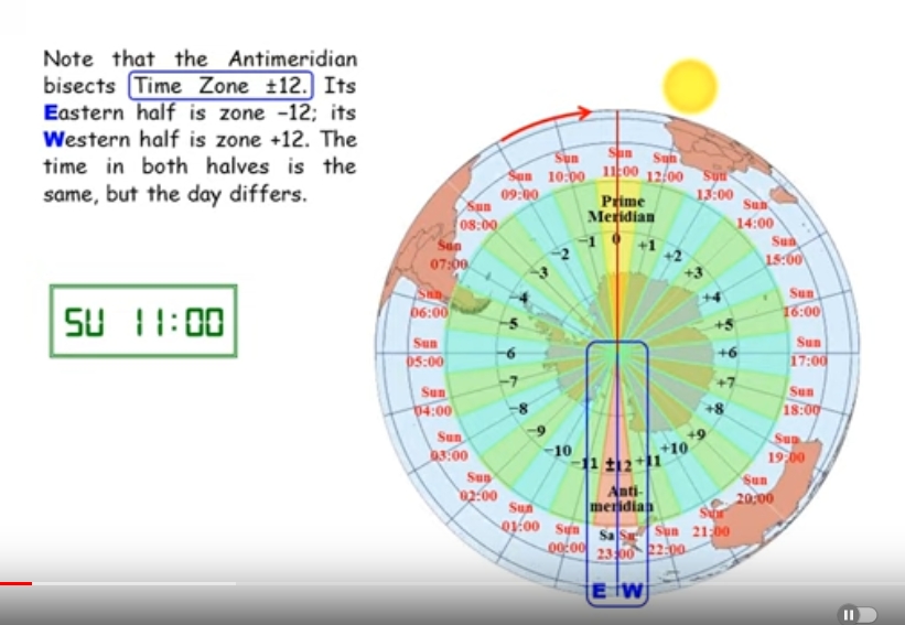 Time Zones and the International Date Line Travel through time, watching the changes, hour by hour, in the standard times of all 24 time zones at once, and learn how the International Date Line works. At tiny.cc/timeanddate you can download the original PowerPoint Show this video was made from. (See the section headed Part 2.) This is a video response to Shepdi's YouTube video How the International Date Line Works. I made this to correct a minor inaccuracy in Shepdi's video. Shepdi's error is as follows: At 0:21 it says that when it's 23:00 to 23:59 at the Date Line, the entire world is on the same day. That is not so. Time Zone ±12 is bisected by longitude 180°. New Zealand is in its western half (+12) and Baker Island (0°11.5'N, 176°28.5'W) is in its eastern half (-12). At Mon, 11:30 UTC, it is Mon 23:30 in NZ, but in Baker Island it is Sun 23:30. Most places geographically within zone -12 keep the time (or at least the date) of one of their neighbouring zones, but a few do keep day & time at UTC-12. So during the hour Mon 11:00 to 12:00 UTC, it is Monday everywhere except in Zone -12, where it is still the last hour (23:00 to 23:59) of Sunday. AND something similar is also true in the next hour, when it is Monday everywhere except in zone +12, where it is the first hour (00:00 to 01:00) of Tuesday. Note also, that, unlike the impression conveyed at 0:30 in Shepdi's video, when it is midnight at the Date Line, it is midnight throughout time zone ±12, which straddles the Date Line.